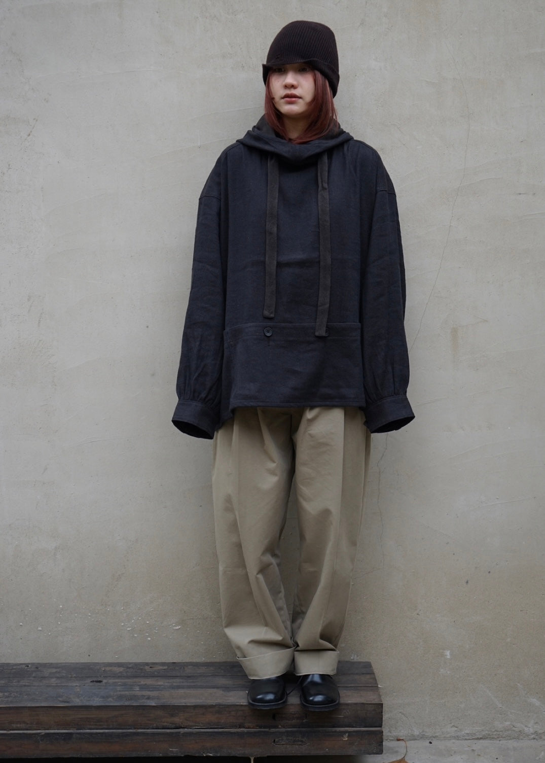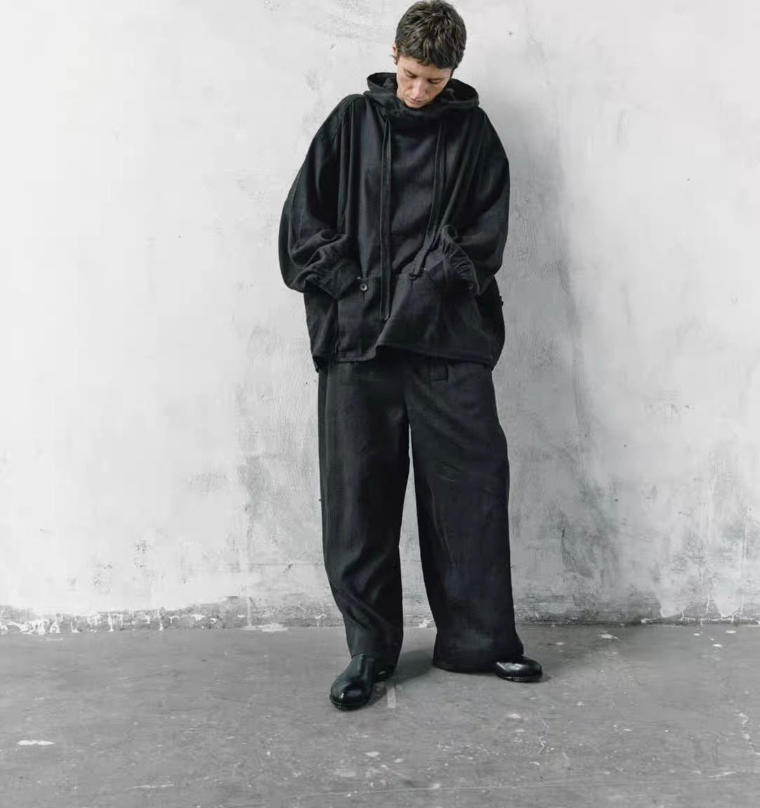 25春夏 色织丝麻蓝褐色粗斜纹连帽多袋外套